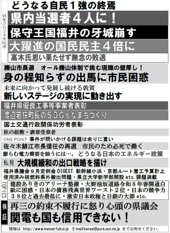 | 立ち読みする ■ 特集 政治を問う 〜高速増殖炉 引くに引けない事情〜 ■ 特集 政治を問う 〜西川知事は政策の誤りを認めよ〜 ■ 公共事業に群がる悪事を許すな! 丹南地域総合公園 |