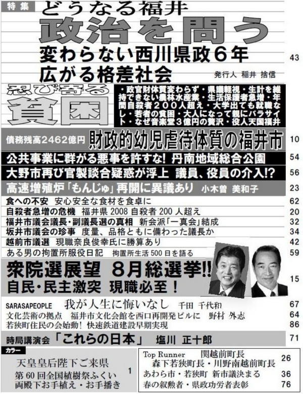 | 立ち読みする ■ 特集 政治を問う 〜高速増殖炉 引くに引けない事情〜 ■ 特集 政治を問う 〜西川知事は政策の誤りを認めよ〜 ■ 公共事業に群がる悪事を許すな! 丹南地域総合公園 |